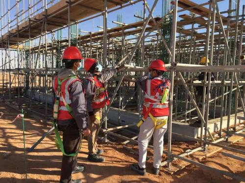 在進(jìn)入施工現(xiàn)場前,項(xiàng)目部還將國內(nèi)班前教育模式帶到沙特,并創(chuàng)新加入班前早班環(huán)節(jié),“百人”齊開安全早班會(huì),提高工人的安全意識(shí)與能力。在施工中,項(xiàng)目部采取了很多有效措施****限度保障安全。在當(dāng)?shù)嘏R邊防護(hù)的基礎(chǔ)上,加設(shè)了標(biāo)準(zhǔn)化防護(hù)欄桿;腳手架通道口安裝懸掛紅、黃、綠牌,按50個(gè)作業(yè)工人配置一個(gè)安全員進(jìn)行安全管理,堅(jiān)決阻攔無關(guān)人員、PPE佩戴不齊全人員進(jìn)出腳手架進(jìn)行作業(yè),保障六個(gè)站點(diǎn)來自中國、巴基斯坦、印度、孟加拉、尼泊爾等八百多現(xiàn)場勞務(wù)人員作業(yè)安全……