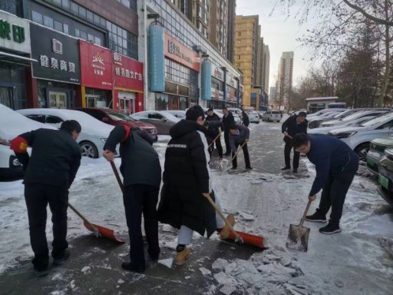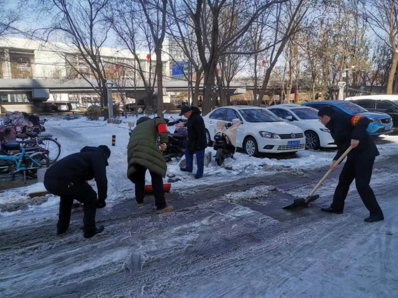 路面積雪經(jīng)過行人及車輛的踩碾及降溫結(jié)冰變得又厚又硬,給清掃工作帶來了極大困難,但集團(tuán)公司的黨員志愿者們不畏艱苦,干勁十足。活動中,大家分工明確、相互配合,利用鐵鍬、雪鏟等工具,有條不紊地開展積雪清理活動,重點(diǎn)對停車場主干道、人行通道及自行車存放處進(jìn)行了集中清理,確保了日常路面暢通和群眾出行安全。
