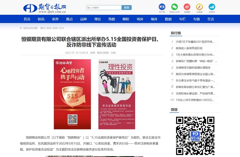 2022年5月為第三屆全國防范非法證券期貨宣傳月,本屆防非宣傳月的主題為“選擇合法機(jī)構(gòu),遠(yuǎn)離非法主體,堅(jiān)持理性投資,謹(jǐn)防上當(dāng)受騙”。為進(jìn)一步加大防范非法證券期貨宣傳力度,提示非法證券期貨活動風(fēng)險(xiǎn),增強(qiáng)人民群眾對非法證券期貨活動的防范意識和能力,恒銀期貨有限公司(以下簡稱“恒銀期貨”)在河北證監(jiān)局、河北省證券期貨業(yè)協(xié)會的指導(dǎo)下,組織了“五個(gè)走進(jìn)”系列活動,走進(jìn)了校園、社區(qū)、企業(yè)進(jìn)行了系列反詐防非活動,并以此為契機(jī)宣傳期貨相關(guān)知識,發(fā)揮期貨公司服務(wù)實(shí)體經(jīng)濟(jì)發(fā)展的專業(yè)價(jià)值。