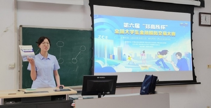 隨后,投資咨詢部分析師王大元為學(xué)生介紹了第六屆鄭商所杯模擬交易大賽,講解了期貨交易過程中出現(xiàn)的“加倉”“鎖倉”等概念,并對如何使用交易軟件進(jìn)行了重點(diǎn)解讀,引導(dǎo)同學(xué)們在官網(wǎng)學(xué)習(xí)專區(qū)進(jìn)行學(xué)習(xí),鼓勵同學(xué)們踴躍參賽,爭創(chuàng)佳績。