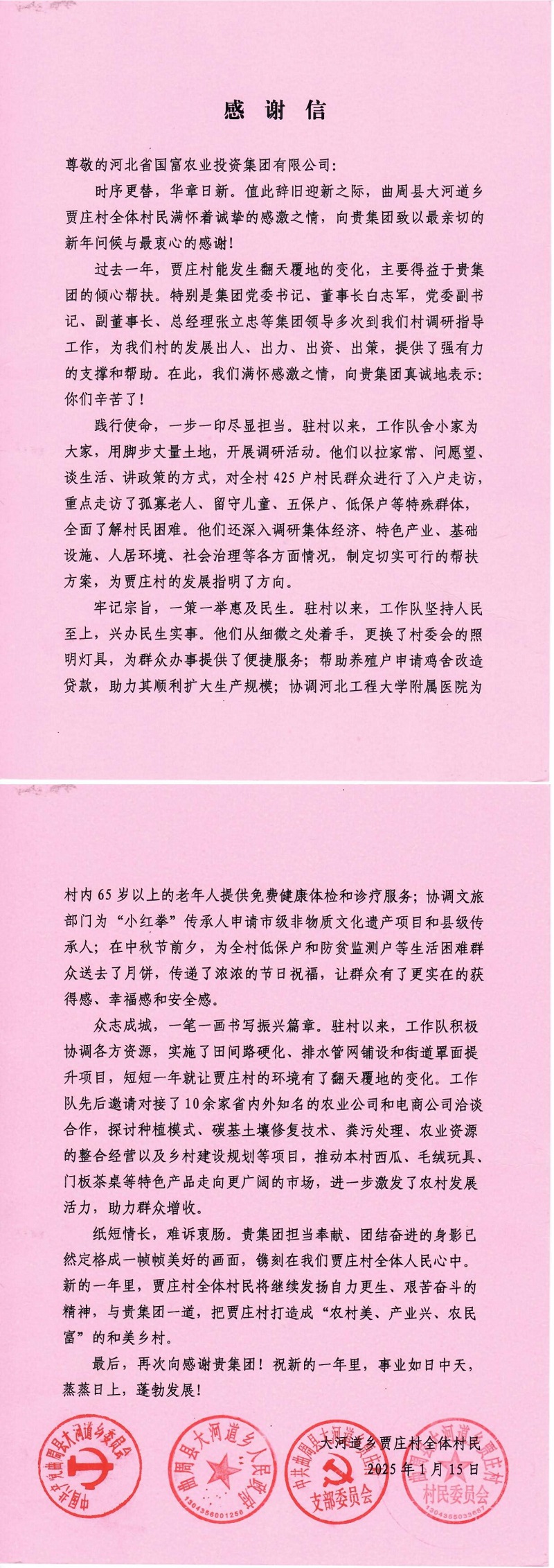 2024年,國富集團駐賈莊村下沉工作隊緊緊圍繞發(fā)展集體經(jīng)濟、推進鄉(xiāng)村振興的目標,深入學(xué)習(xí)中央政策方針及省市縣委組織部和集團黨委有關(guān)下沉工作要求,扎實開展駐村幫扶工作,經(jīng)過一年的努力,取得初步成效,同時也得到了曲周縣大河道鄉(xiāng)和賈莊村的認可,特給我集團送上錦旗和感謝信!