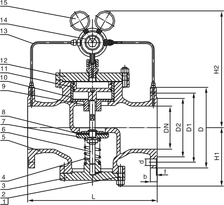 本系列減壓閥屬于先導(dǎo)活塞式減壓閥。由主閥和導(dǎo)閥兩部分組成。主閥主要由閥座主閥盤、活塞、缸套、彈簧等零件組成。導(dǎo)閥主要由閥座、閥瓣、膜片、彈簧、調(diào)節(jié)彈簧等零件組成。通過調(diào)節(jié)調(diào)節(jié)彈簧壓力設(shè)定出口壓力,利用膜片傳感出口壓力變化,通過導(dǎo)閥啟閉驅(qū)動活塞調(diào)節(jié)主閥節(jié)流部位過流面積的大小,實現(xiàn)減壓穩(wěn)壓功能。